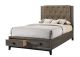 This transitional storage bed provides the perfect balance of comfort utility and style. Diamond button tufted upholstered headboard with two drawers under footboard for plenty of storage. Wooden rustic gray oak finish veneer frame, wood tapered leg, and trim in black finish. The Avantika collection its complemented by matching case goods with capped with elegant faux marble tops, English dovetail construction drawers on metal glides, and black finish wood single pull knobs. All in all, charming and practical.