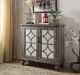 The transitional Velinka Console Table features a weather gray finish with mirrored glass doors and a diamond trim inlay. Two cabinet doors open on the rectangular wood console table to reveal ample shelf space for additional storage. The modern style cabinet with gray tones, matching gray inlay and bun legs will add a stylish accent to every room in your home. Whichever room you choose to use the Velinka in its style will not only blend masterfully but is sure to be the conversation piece.