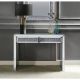 Assembled, Rectangular Console Table Storage: 2 Drawers Features: Mirrored Top, Mirrored Sled Base, Front Drawers w/Faux Diamonds Inlay & Clear Glass (Open Base) CONSTRUCTION: Mirrored Sled-Frame: 4mm Mirror w/Beveled Edge, MDF () Front Drawers: Mirrored Trim, Faux Diamonds Inlay, 4mm Clear Tempered Glass, MDF Drawer: GLIDE Side Metal (2/3 Ext.), DOVETAIL French Front, Full Black Finish Inside (Felt NOT Included), Safety Stop Included, Manual Close