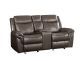 Cuddle up in this decadently plush Lydia sofa set. The set is upholstered in a warm and earthy brown leather-aire. Distinctive elements include wraparound padded armrests, along with a few hidden surprises. The richly styled reclining sofa features a drop-down tabletop with cupholders and AC power and USB ports to accommodate the modern home. The loveseat includes a center console that also features cupholders and AC power and USB ports. The recliner features a gliding mechanism for added comfort.
