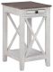 Modern meets vintage in this accent table. Made of woods in a distressed white and gray finish, the crossbuck supports on two sides create a vintage vibe. With two USB charging ports, the accent table also adds modern function. The storage shelf and drawer make this piece a must-have for your living space.