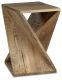 This accent table puts a new twist on vintage casual. Its brown finish is delightfully distressed, drawing attention to the saw mark planks arranged in an open architectural design. Place this unique piece next to a cozy chair to create a charming reading nook overflowing with visual intrigue.