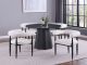 Reimagine your dining room with the fresh, elegant character of a five-piece modern dining set. Centered on a round table with a faux black marble tabletop, the set offers compelling contrast and dimension in a kitchen or dining room. The tabletop is printed black melamine, designed to provide seamless character at an affordable price point. The base of the table is a star pedestal crafted in hammered black metal, offering artistic flair to your space. Four side chairs complete the set, pairing black hammered legs with plush cream upholstery with charming texture and plush cushioning.