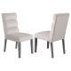 A pillowy look and feel brings ultimate comfort to a casual living space, targeting your kitchen or dining room with a light, floaty vibe, and adding a festive feel. This set of two side chairs checks all the boxes of design, comfort, and easy-living elegance standards you embrace to make a setting fashionable and functional. These chairs feature rubberwood and hickory wood framing, with a cool gray finish over slightly tapered legs. Soft fabric upholstery embellishes a cleverly styled seating unit with an extra-high back and horizontal channeling. A tight yet plump seat provides perfect balance to round out a sleek design.