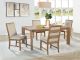 Soothing natural, neutral hues introduce refined style to a modern room set. Offering a soft natural brown wood grain finish over ash veneer and rubberwood, the set delivers an inviting, approachable ambiance to your kitchen or dining room. The table features a spacious rectangular tabletop with angled legs and an angular apron, creating eye-catching flair. Chairs offer soft oatmeal fabric upholstery over plush foam padding, and feature wooden ladder details on chair backs, adding a sense of character and structure. This charming set is a perfect choice for a family dining room.