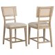 Elevate your dining experience with this stylish counter-height chair, combining natural beauty and modern comfort. Crafted from solid wood, this chair features a hand-woven radio weave cane backrest that adds a light and airy feel to your space. The foam seat cushion, upholstered in soft beige fabric, ensures comfort while dining or entertaining. Designed with clean lines and sturdy construction, this counter-height chair also includes a footrest with a brass-finished metal kick plate for added durability. Perfect for pairing with your counter-height dining table or kitchen island, this chair blends timeless elegance with practical functionality.