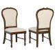 Complement your chic dining ensemble with a set of two traditional dining side chairs. Each boasts durable construction in Asian hardwood, complete with a rich brown finish. Chairs are designed with decorative rounded backs, framed in wood to create definition and character. Upholstery is paired with foam and features a crisp ivory color, creating contrast and depth against the rich wood grain. Legs are turned, with decorative stretchers that add detail and intricacy to your kitchen or dining room.