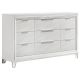 Add a touch of elegance to your bedroom with this spacious 9-drawer dresser, featuring a modern Italian design. The white finish, combined with picture framed recessed panels and embossed herringbone graphic patterns, creates a sophisticated look. Accented with mirror framing, acrylic legs, and polished chrome metal hardware, this dresser offers ample storage space. The top center drawer includes a removable jewelry tray, and all top drawers are felt-lined for added luxury. Crafted from Asian hardwood, MDF, and mirror, this dresser combines style and practicality.