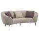 Bring fresh, effervescent energy to your living room with a modern upholstered sofa that shows off your curve appeal. This great piece, in soft beige with wonderful texture, is designed to float in the center of a room as an attractive focal point. Its rounded, kidney-inspired silhouette is framed by extra wide channel details, with plush foam cushioning for excellent comfort. The sofa is complemented by premium filled accent pillows featuring a wide corduroy stripe and plum textured boucle, adding texture and dimensionality. Underneath, stylish tapered black powder coated metal legs are gracefully splayed for a vintage touch, complementing the height they add for an airy finish.