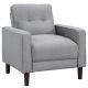 This accent chair brings timeless charm and modern comfort to compact living spaces. Designed with classic track arms and self-welt detailing, it showcases refined craftsmanship and clean lines. Grid-tufted back cushions and pocket coil seating deliver plush comfort and reliable support, while tall tapered brown legs provide a sturdy foundation and a mid-century touch. Upholstered in durable, easy-clean performance fabric, this chair combines everyday functionality with effortless contemporary style.