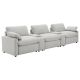 This three-seat home theater seating set combines modern convenience with plush comfort. Each power recliner offers smooth adjustability, while two center consoles feature lift-top storage and dual stainless steel cup holders. Upholstered in soft fabric, the generously padded cushions and pillow-top armrests enhance relaxation. Built for durability and long-lasting support, this seating arrangement is perfect for creating a cozy entertainment space.