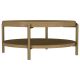 This round coffee table combines modern design with rustic charm, perfect for today’s living spaces. Crafted with rubberwood, engineered wood, and ash veneer, its smooth finish highlights the natural wood grain for an organic appeal. The lower shelf features woven rattan, offering practical storage and a textured look. Supported by aged brass-finished metal legs, this cocktail table delivers a balance of durability and style, serving as a functional centerpiece for any living room or lounge area.