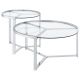 With just a bit of glam style, this casual nesting coffee table set is bright, light, and pleasing. Your living room or family room comes to life with a table set including one large and one small round table that display side by side and nestle together between uses. Pie cut out tops are fitted with a clear tempered glass insert, adding sparkling brilliance. Tripod-style chrome bases create a gleaming effect. A pencil polish edge profile combines with glass transparency to create the effect of floating discs, creating a timeless look with effortless beauty.