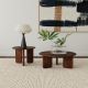 Enhance your living space with this modern coffee table set, featuring a round coffee table and a matching end table. Both pieces are crafted from solid mango wood with a rich brown finish that highlights the natural wood grain. The round tabletops with softly rounded edges offer a sleek yet inviting look, while the distinctive base designs bring depth and visual intrigue. Inwardly angled slab legs with rounded corners provide stability and an artistic touch, creating a cohesive and stylish occasional centerpiece for your home.