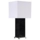 Imagine a crisp modern aesthetic working as a light source in your updated living room or bedroom. Designed with clean geometric principles, this contemporary lamp delivers a sharp, energetic attitude and a strikingly contrasting palette. An embossed crocodile pattern adds texture to its black rectangular body, sleek and satisfying as well as an indicator of glam. A square chrome metal base features charming, dainty feet. A white fabric square lamp shade follows silhouetting to maintain consistency.