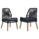 Create a nautical-inspired space with this pair of contemporary dining chairs. With a frame constructed of a sturdy solid mahogany wood, and tapered flared legs in a weathered finish, these transitional style dining chairs are perfectly suited for anything from coastal cottages to lakeside retreats. Featuring a seat frame that is wrapped in a woven poly rope fibers all around, this chair offers a breathable backrest and open and airy design. Slide these chairs up to a dining table or place them in a corner to soften and accent the space. To add to the seating comfort is a foam-filled cushion, wrapped in a dark blue fabric that matches the dark navy rope silhouette.