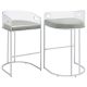Ultra-modern with a retro-inspired vibe, this pair of stools make a striking piece to a dining room space. With a curved backrest in a clear acrylic material, each stool offers an open and airy design. Rest comfortably on a leatherette cushion as you dine or sip a cocktail. In addition, each stool is supported by a slim metal legs in a lustrous chrome finish and a base shape that mimics the rounded acrylic backrest. Pull up a pair of these stools to a kitchen bar or complete a compact home bar.