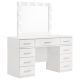 Covered in a high gloss white finish for an all-around sleek look, this contemporary vanity desk and matching mirror are perfect for dressing areas and bedrooms. Store cosmetics, perfume bottles and more within the multiple drawers to keep your vanity neat and tidy. Felt-lined top drawers invite you to also keep delicate items like jewelry, silk scarves and accessories. Situated on the top of the vanity dresser is a Hollywood style mirror, surrounded by 11 bright white LED lights that offer an even glow. Sleek chrome metal pulls adorn each of the drawer fronts, lending a modern flair.