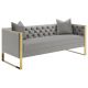 This visual appeal of this modern two-tone sofa will grab you, but it's the cozy comfort that will have you falling head over heels. First to catch your eye is the button tufted velvet upholstery in a cool light grey finish, which is as soft to the touch as alluring to the eye. Two included throw pillows will have you looking forward to your next nap, as well. Next to catch your attention is the gold stainless steel base that wraps around the arms and acts as U-shaped legs. This mix of gold metal and soft grey fabric come together in a sofa that will become a classic gathering place in no time.