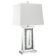 This modern table lamp features a rectangular base framed with beveled mirrored panels and sparkling crushed acrylic crystal inlay. Its geometric design delivers bold symmetry and a touch of glamour, anchored by a crisp white shade that softens the light. The reflective surfaces and shimmering textures create an...