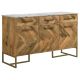 Elevate your space with this striking accent cabinet, blending natural wood tones with modern sophistication. Crafted from eco-friendly solid mango wood, the cabinet features a bold chevron pattern that adds depth and character. A sleek marble top offers a luxurious touch, while antique gold-finished metal legs and pull handles enhance its contemporary appeal. Designed for both style and storage, it includes three drawers and three spacious cabinets with interior shelving, making it perfect for entryways, dining rooms, or living spaces.