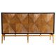 Bold texture and dynamic form converge in this four-door accent cabinet featuring a hand-applied sunburst motif. The intricate radial design is crafted with layered wood strips, framed in a rich brown outline and contrasted by a golden base. Angled, tapered legs enhance the silhouette, while magnetic door closures keep the...
