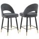 This set of two counter height stools features an elegant bucket style seat that lends a retro-inspired Mid Century modern look. Each stool offers long-lasting, supportive seats for each guest, wrapped in faux leather upholstery that complements numerous color palettes and adds a bold statement piece. Flared, tapered legs further lend to the vintage flair. Gold capped feet and a supportive foot brace offer a dramatic, regal Hollywood glam touch. Pull these stools up to a spacious entertainment room bar for cocktails.