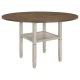 Uniquely fashionable and supremely functional, this counter height dining table has it all. Perfect for spontaneously switching up your style, the square tabletop features four drop down leaves to convert it to a round shape. An open shelf is built into the base for the added convenience of storage space. A two-tone finish of nutmeg and rustic cream adds elegant dimension to this eye-catching piece. Complete with square, turned legs, this charming table puts a creative spin on a classic country design.