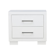 Sleek, stylish, and modern, this nightstand is a pleasing addition to any bedroom. Crafted from solid wood, it provides a sturdy surface for books, lamps, vases, and more. A soft, simple snow white finish provides an appealing contrast to its sharp, contemporary silhouette. Silver tone bar handles round out its glamorous look. Two spacious drawers offer ample storage space, helping to keep your room neat and organized.
