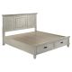 With a casual, rustic vibe perfect for a beachside cottage, this platform bed features a shutter style paneled headboard that lends a tropical design. The bed frame also boasts a subtle wire-brushed finish with molding accents. The footboard offers two spacious drawers, each with soft-closing drawer glides and dark finished hardware. In addition, this lovely bed frame is slightly raised on square carved, tapered feet. Available in three finishes, this bed is sure to fit in your bedroom's existing color palette.