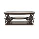 This elegant coffee table blends timeless design with practical functionality. The clear tempered glass top offers durability and a polished look, while the dark bronze powder-coated metal legs add a refined touch. A dark merlot wood finish highlights the engineered wood and cherry veneer construction. The middle shelf features a glossy wooden surface, offering additional display or storage space. Intricate scrollwork detailing enhances the classic appeal, making it a perfect centerpiece for any living room.