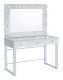 With a Hollywood regency flair, this modern vanity set features a stunning mirror paneled design that reflects surrounding hues. Cleverly designed with a clear tempered glass top that showcases cosmetics and accessories tucked inside the three drawers beneath, this vanity offers a unique functionality. Adorned on each of the three bright white drawers are crystal-like acrylic pulls, further lending to its dramatic glam flair. Mounted on the back is an oversized mirror framed in a mirror-like polished chrome metal finish, complete with a series of retro-inspired, Edison-style LED bulbs. Constructed with a heavy gauge steel base, this vanity set is made to last.