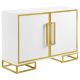 Add a bold statement piece to your space with this stunning modern accent cabinet. Featuring a glossy white finish with lustrous gold stainless steel trim, it showcases Art Deco flair with clean lines and geometric base supports. Behind double doors, adjustable shelves offer customizable storage. Crafted from durable MDF and stainless steel, this cabinet blends glamour and function beautifully in any setting.