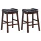 Simple and stylish, this contemporary counter stool is perfect for a kitchen island or home bar. A curved saddle-style seat offers optimal comfort with plush cushioning. Tufting adds dimensionality to a backless and armless silhouette. Black leatherette upholstery is always stylish, and is easy to care for. Angled legs are crafted in wood and feature a rich cappuccino finish, while built-in footrests offer easy relaxation.