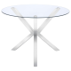 This round dining table delivers crisp geometry and contemporary appeal. A clear tempered glass top keeps the profile light and airy while offering durability for daily use. The sculptural metal base features an asterisk design, adding architectural interest beneath the surface. Electroplated in polished chrome, the base...