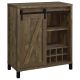 Perfect for a mountainside cottage or lakeside retreat, this bar cabinet features a rustic oak finish that is both handsome and charming. Place this bar cabinet in a rustic farmhouse home, as it offers a masculine rustic charm. It shows off a single sliding barn door that offers ample storage space and an adjustable shelf. In addition, this bar cabinet has two open shelves to display favorite decanters and barware, along with an eight bottle wine storage compartment. The wood designed chest is mounted on supportive, straight steel legs in a powder coated black finish.