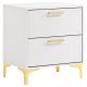 Flank your bedside with this modern glam nightstand. Designed with an elegantly understated, boxy frame, this two-drawer nightstand lends a chic, contemporary aesthetic. Clean lines and a bright, white finish elevate its sophisticated nature. Fastened to each deep drawer is a slim gold pull handle for a touch of metal. Unifying the warm metallic elements are gold bracket style legs that lend a retro look and feel.
