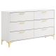 Maintain a cheerful and luxe bedroom with this splendid modern glam dresser. A perfect statement piece for contemporary bedrooms, this six-drawer dresser presents a light and airy expression. Accented with gold finished drawer pulls and bracket style legs, a luxe vibe shines through. The crisp, white finish maintains a sleek, dignified presence as well. Long and narrow, this dresser makes a lovely addition to your bedroom's focal wall and grounds a vanity dressing area.