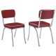 Complement a retro dining table and other decor with this chrome plated chair. Seat frame and legs gleam in chrome plating. Legs angle slightly out and seat gently reclines for a casual silhouette. Seat back and thick cushion are wrapped in luscious red with white piping. Tip: the red perfectly disguises an ace of hearts when you need a trump card.