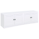 Create plenty of storage to accompany your large screen television with this modern TV stand. Designed to host a TV up to 85 inches, it's a long, linear structure with clean, precise lines that blend into most spaces. Its neutral finish complements melamine surfaces that add durability, perfect for a family living space. Four doors open to reveal interior shelving that's adjustable and includes cord management openings for easy organization of media and gaming components. Use the added shelving for accessories and media in your tidy, organized space.