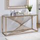 Here's a beautiful statement piece that might be relegated to a corner but will definitely attract attention. This sofa table is part of a mirror-table combo that exudes glam and posh with their brilliant gold-plated frame and intricate lines.