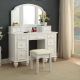 Treat yourself to a glorious morning ritual with this lovely, antique style vanity and stool set. Look through the arched, tri-fold mirror sitting atop a padded fabric stool and comfortably beautify to your heart's content.
