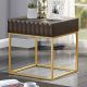 A wooden frame and metal base come together for a trendy ensemble that will fit your contemporary space well. The matte gold finish is the stand out here - the simple cube silhouette is striking in contrast to the deep walnut finish of the frame. The front panels feature a familiar pattern which conceals drawers with no visible hardware. The drawers open smoothly on ball-bearing glides.