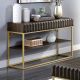 A wooden frame and metal base come together for a trendy ensemble that will fit your contemporary space well. The matte gold finish is the stand out here - the simple cube silhouette is striking in contrast to the deep walnut finish of the frame. The front panels feature a familiar pattern which conceals drawers with no visible hardware. The drawers open smoothly on ball-bearing glides.