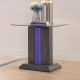 This living room table set from the Rhyl Collection is a contemporary masterpiece. This unique set features a wood and metal design finished in a sleek, gray finish. This finish is highlighted by the glass table tops and the embedded blue LED lighting in each of the pieces, creating a high-tech but relaxing atmosphere.