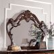This traditional masterpiece is covered in intricate faux wood details, made to look like carved wood in complex foliage patterns. These ornamentations are found on the edges of this mirror with a unique shape and exquisite styling to match the set. If classic extravagance is your cup of tea, the Rosewood collection has plenty of it.