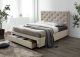 Comfort and functionality are the hallmarks of this fully upholstered, mattress-ready bed. On the comfort side, there's the rich linen-like fabric that wraps around the frame of the bed, culminating in a simple rectangular headboard with beautiful diamond tufting. Functionality-wise, the foot end of the bed is a smooth rolling drawer with casters; it's the perfect storage spot for any extra pillows or beddings within arm's reach.