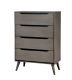 For a quick modern update to your home, this collection will add that trendy mid-century appeal. Featuring a Gray finish, this chest boast slim flared legs and recessed handle drawer pulls.