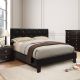 This black padded leatherette bed helps bring about the beauty of this set. Crystal-like acrylic buttons adorn the tufting in the headboard, while matching case goods mirror the simplicity of the bed with straight lines and simple silhouettes. Available in five sizes.