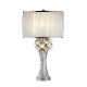 If you're looking for something over the top, this spectacular table lamp is for you. It comes with a pleated white sheer shaped in oval, with floral accents, and a silver body with glitter embellishment.